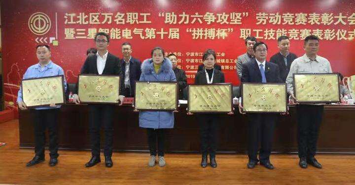 浙江在线-宁波频道12月18日讯(浙江在线通讯员 周永卫 王际明 记者 贺元凯)12月16日上午,江北区万名职工“助力六争攻坚”劳动竞赛表彰大会在三星智能电气有限公司报告厅召开。赛克思液压科技股份有限公司液压泵研发中心、宁波瑞孚工业集团有限公司工程部荣获2019年宁波市“工人先锋号”荣誉称号,浙江盛世前程人力资源服务工会联合会供电服务班组、康赛妮集团有限公司技术质量中心荣获2018年度江北区“工人先锋号”荣誉称号,宁波立鑫液体化工运输有限公司赵守杰、宁波送变电建设有限公司运维分公司张立新、江北区慈城镇中心卫生院李春燕荣获2019年度江北区“首席工人”荣誉称号。江北区区委副书记、政法委书记张飞宇到会并讲话,宁波市总工会副主席宋雁、江北区人大常委会副主任、区总工会主席孙新土等有关领导出席了会议。江北区产业工人队伍建设改革工作相关牵头单位及职工代表共200余人参加会议。
