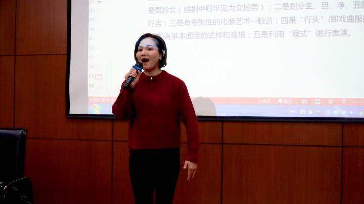 从平调的起源到表演特色,从戏曲行当名到戏曲表演的基本形式,唐洁妃为在场师生一一细数讲解,还不时穿插现场演示,丰富翔实的图文资料,声情并茂的现身说法,为在座师生奉上了一场艺术盛宴。