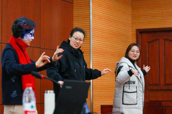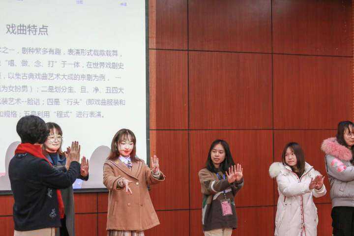 在现场教学环节,唐洁妃选取了日常生活和舞台表演中均较为常见的“开门、关门”场景,邀请同学们一起上台体验学习,并手把手地予以解析指导,让大家直观感受戏曲程式化表演的特点,及其与日常生活动作的差异。