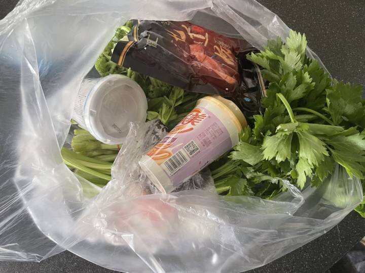 5月2日,奉化方桥街道宁南新城盈园小区被划进“三区”,9幢2单元属于“管控区”,“三区”内居民每两天配送一次生活物资。5月4日上午,一批物资送进了小区,青菜、芹菜、鸭肉、鸦片鱼头、火腿肠……菜品有七八种。当天上午做完核酸检测后,居民们顺带在楼下领了物资包。