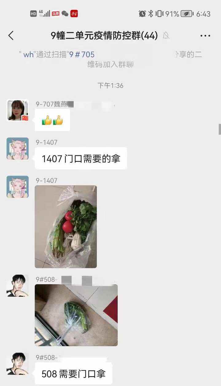 当天分发完物资后,上官志辉还在单元楼的互助防疫群内打了声招呼“大家有多余的菜可以与邻居们分享”。很快,楼栋里有了后续。508门口出现了蔬菜包;1407业主在家门口放了芹菜、番茄、玉米;1805业主还在门口放了面筋、沙琪玛等小零食;1306家缺鸡蛋,有邻居在门口放了鸡蛋……连续两天,陆续有人在家门口摆放食材。