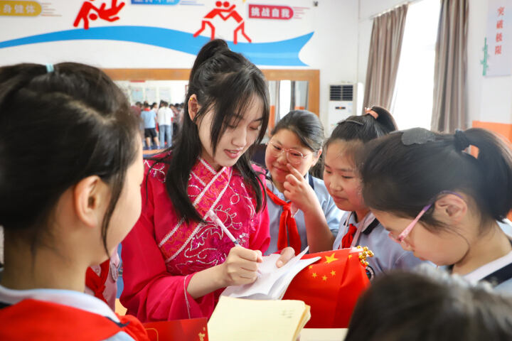“姐姐,你能给我签个名嘛?”演出结束几位大学生宣讲员俨然已经成了小学生眼中的“明星”,孩子们争着找他们要签名。大学生们也认真地在孩子们的小本本上留下了勉励和祝福的话语。