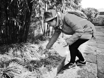 在慈城古镇的孔庙景点,看到路边有一只矿泉水瓶,张萍花赶紧捡到垃圾袋里。
