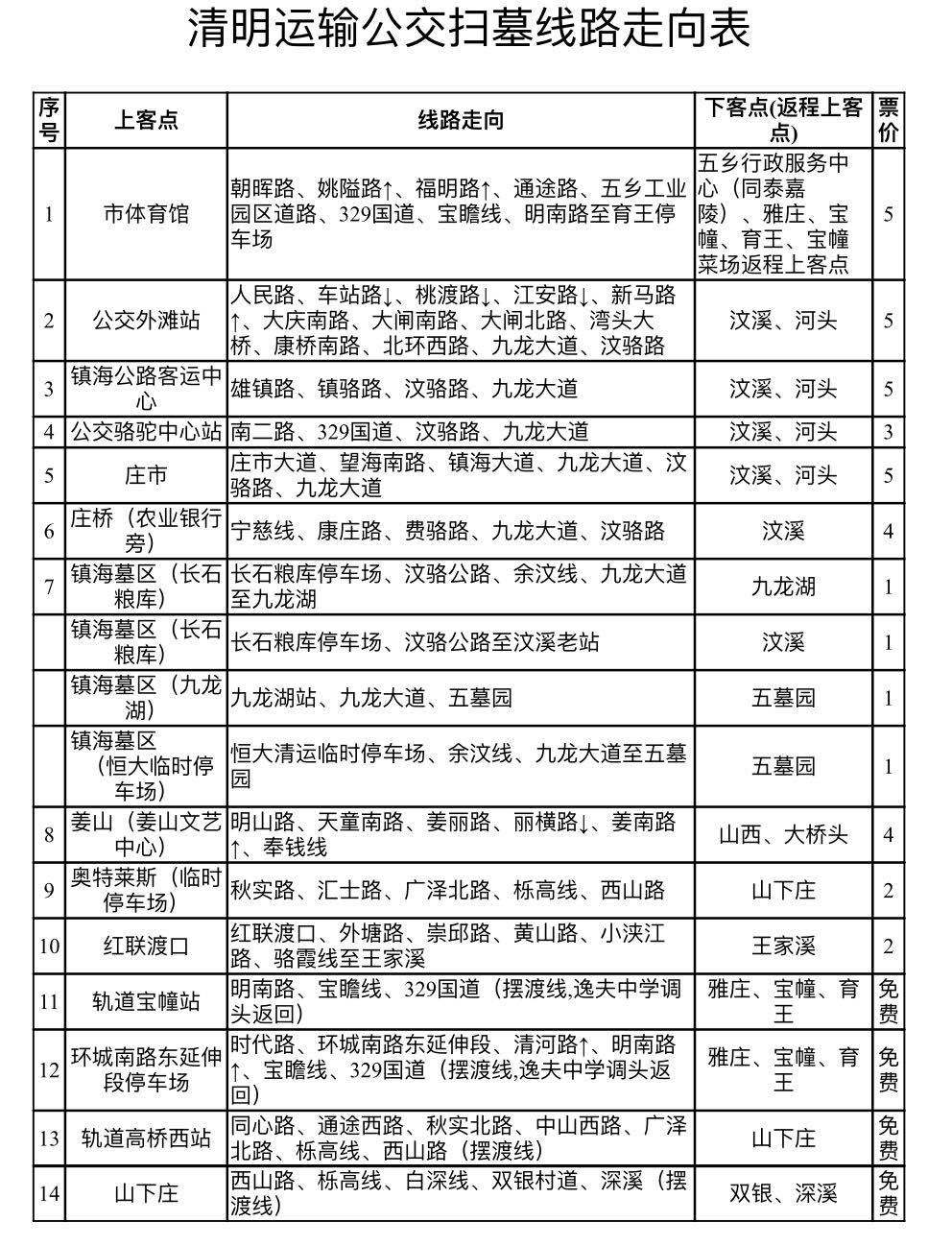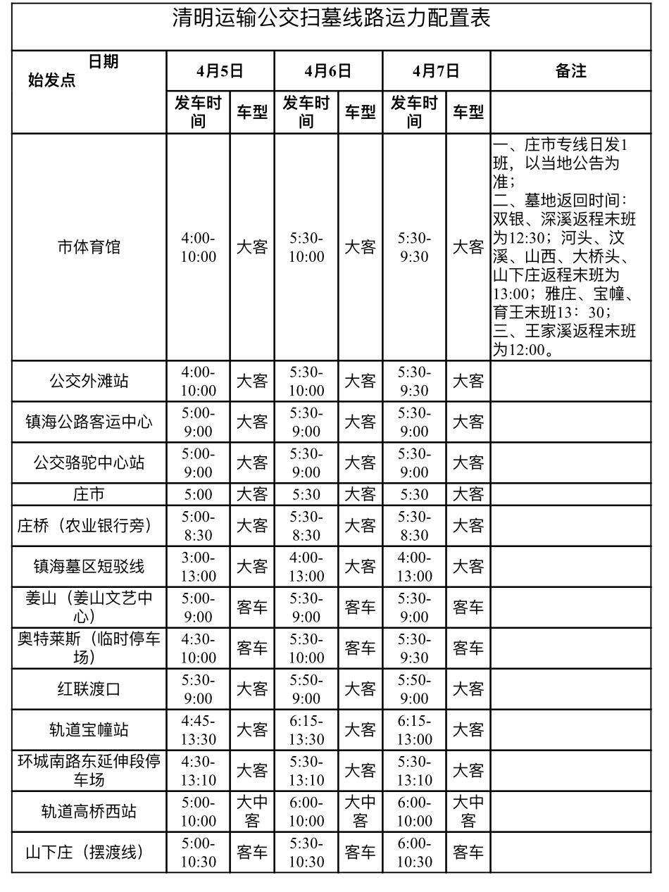 轨道交通4月5日起将执行清明节特殊日时刻表。轨道高桥西站、栎社机场站和清水浦站首班车提前至4:00,东环南路首班提前至4:30,霞浦站首班提前至5:00, 4月6日、7日,轨道高桥西站、栎社机场站和清水浦站首班车提前至5:30,霞浦站首班6:00。同时,34条开往墓区方向的公交线路首班时间也将提前。而且为保障公交专线,减轻道路交通压力,计划临时停开18条公交线路,临时改道或缩线13条公交线路,增开区间线1条。