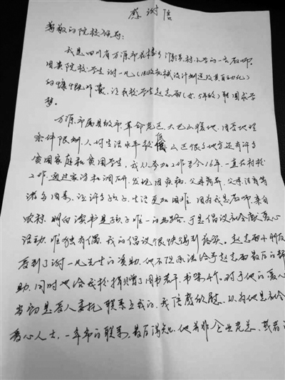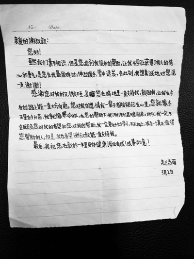 赵志雨工工整整地写道:“亲爱的谢叔叔,虽然我们素不相识,但是您给予了我很多的帮助,让我在学习上获得极大的信息和勇气。是您在我最困难时,伸出援手,雪中送炭。”