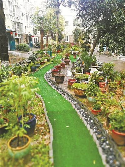 第五个以根雕艺术为主的小花园正在改造之中。“看着楼前的小花园一点一点建起来,我也想出一分力,所以就在花园里布置了一些小花样、小装饰,一些老旧物件改装一下,放到小花园里也不错呢!”热心居民郁小庆说。