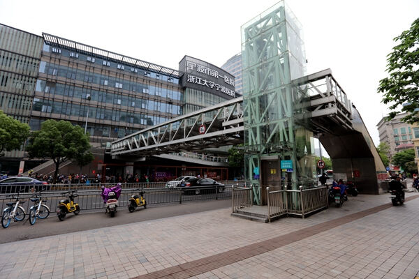 宁波市第一医院人行天桥建于2014年,位于镇明路至解放南路这一柳汀街路段。它采用铝合金桁架结构,标准断面宽度4.8米。北起建设银行大门西南侧,行人可选择自动扶梯、垂直电梯上桥;跨过柳汀街后,天桥在第一医院分成两支,一支以自动扶梯形式落地,另一支通往第一医院门诊楼二楼大厅。过马路的市民,从柳汀街北侧搭乘电梯,穿过天桥达到另一头,不用刻意避让车辆,安全又便捷;而机动车也因为少了行人穿马路的干扰,大大提升通行能力。