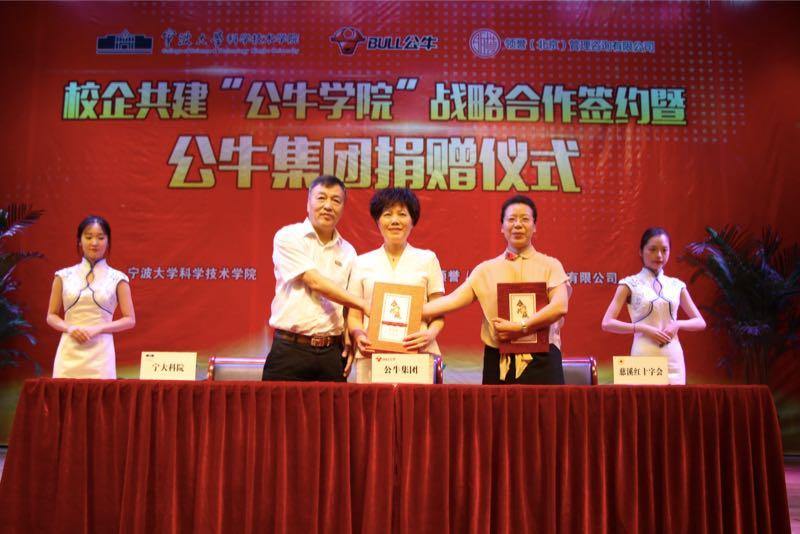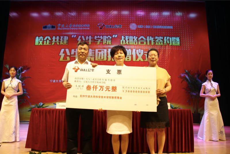 在现场,公牛集团向宁波大学科学技术学院捐资3000万元,用于支持宁波大学科学技术学院校园建设、奖教奖助学和高层次人才提升。此前,沁园集团总裁叶建荣曾向宁波大学科学技术学院捐款2000万元,艾波特环保科技股份有限公司捐款200万元用于学院建设。