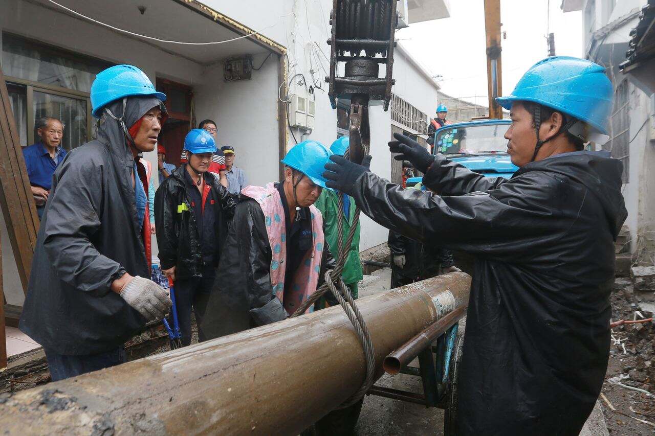 在天童老街施工现场记者看到,电力师傅们晴天一身汗,雨天一身泥。据鄞州区供电公司东吴服务站运行班史班长的介绍,老街道平均只有两米宽。由于老房子的牌楼屋檐较宽,弯道处连两米都不到,吊车要开进这样狭小的空间作业,运出长12米的电杆,还要避开电信光缆等架空线路,几乎不可能实现。同时老街里一共有4根水泥杆是立在居民家中的。面对种种困难,电力施工队采用选择将电杆以屋顶高度为节点,分割成两段,再分两次将电杆吊出。
