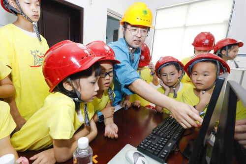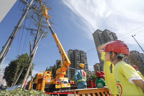 “小候鸟”的第一站是带电作业现场。当天上午,该公司带电作业班在鄞姜公路开展带电拆除10千伏线路上的柱上开关。当绝缘斗臂车缓缓地上升时,孩子们都紧张地为在空中绝缘斗里的两位带电作业员工担心起来。“带电多危险呀,为什么不等停电以后再工作呢?”“为什么要把黄色的套子套在电线上?”孩子们提了一堆问题,工作负责人林志龙就一遍遍耐心讲解。当孩子们知道,带电作业是为了让千千万万户家庭免遭停电时,孩子都竖起了大拇指。
