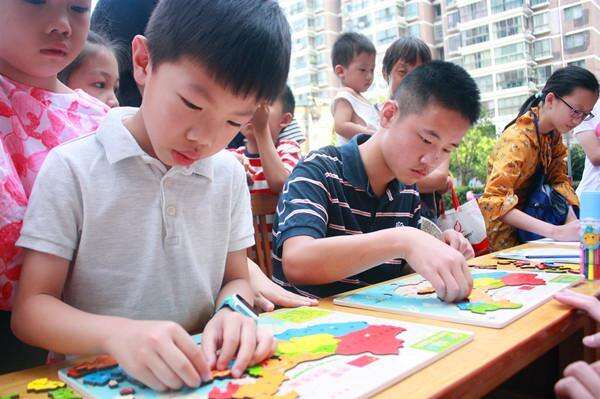 “这块红色的是我们首都北京,这块粉色的是我们可爱的家乡浙江……”一年级的王同学很熟练地拼起了中国地图;而旁边的萌萌小朋友也在奶奶的帮助下描绘着高高飘扬的五星红旗……