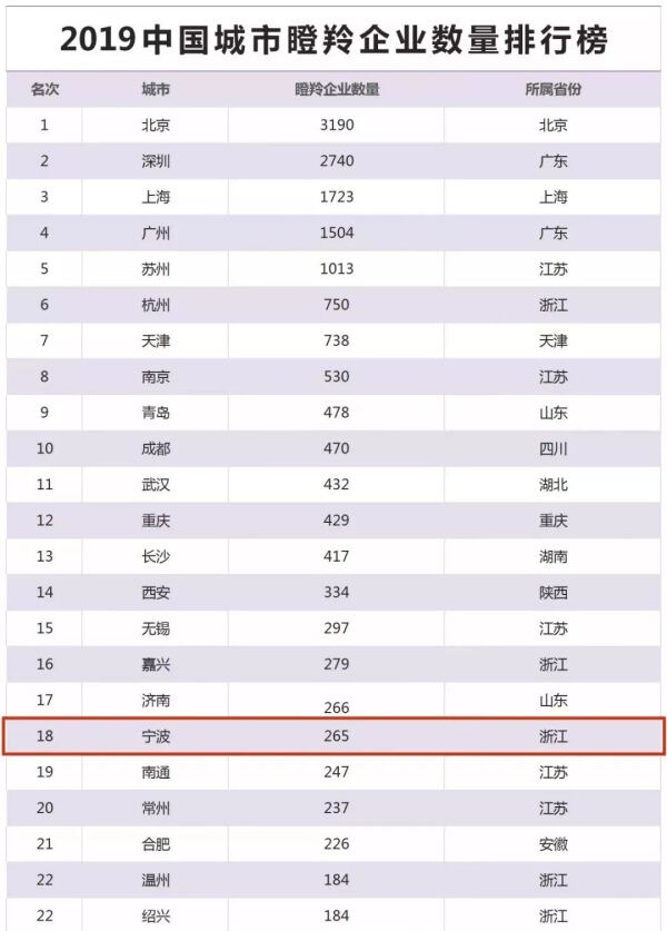 宁波在这张榜单上的成绩可谓是中规中矩,265家企业入围,数量占全国比例超过1%,位居全国城市第18位,省内落后于杭州和嘉兴,数量为杭州的三分之一,与嘉兴相差14家。不过值得一提的是,在“中国新经济领域100家典型瞪羚企业”榜单中,卡特马克智能厨具成为宁波唯一上榜企业。