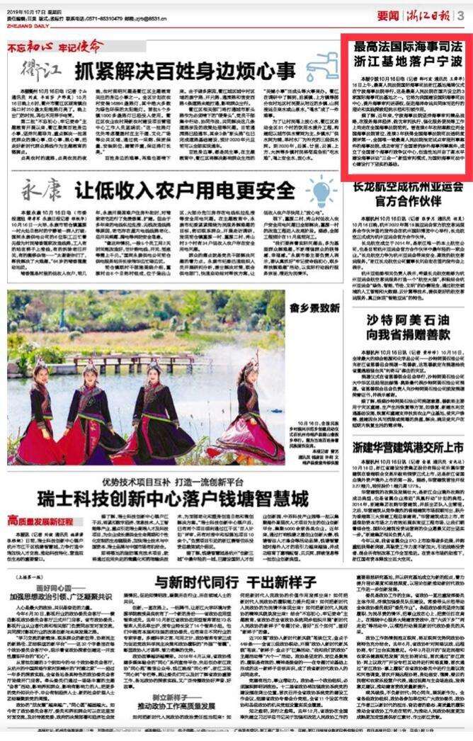 浙江在线-宁波频道10月17日讯(浙江在线记者 邵巧宏 通讯员 王舜毕)16日上午,最高人民法院国际海事司法浙江基地揭牌仪式在宁波海事法院举行,这是最高人民法院在国内设立的3家国际海事司法基地之一。它将为我国建设国际海事司法中心,提升海事审判话语权,促进海洋命运共同体而进行的理论和实践探索起到示范和引领作用。