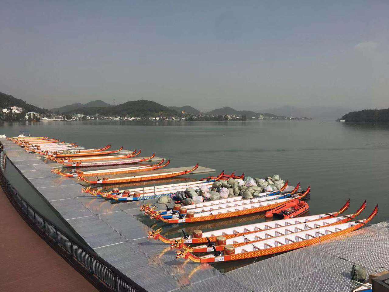 在赛道尽头的登舟码头,24条比赛用舟整齐地停泊在水面上。“比赛用的是传统舟型,12条22人大龙,12条10人小龙,还有6条备用龙舟。”