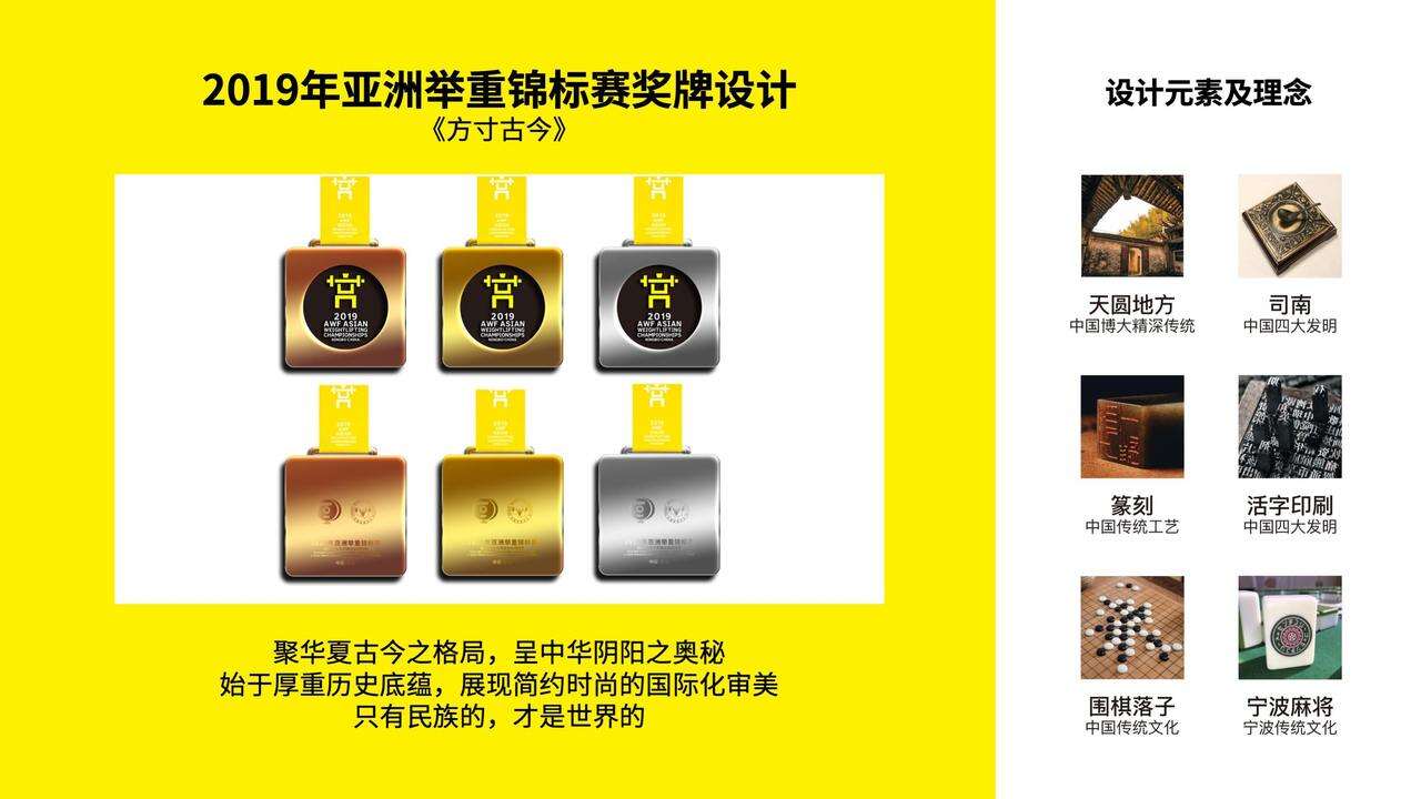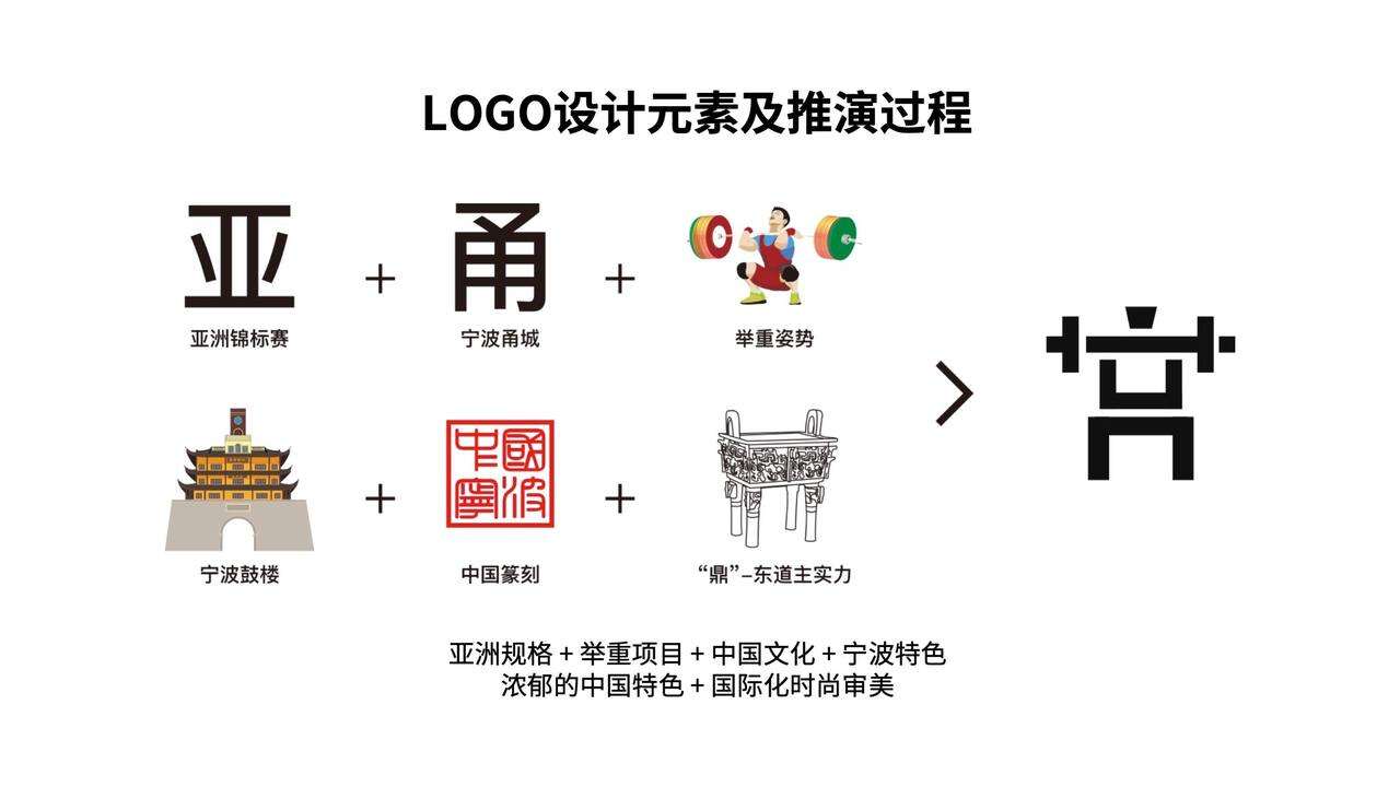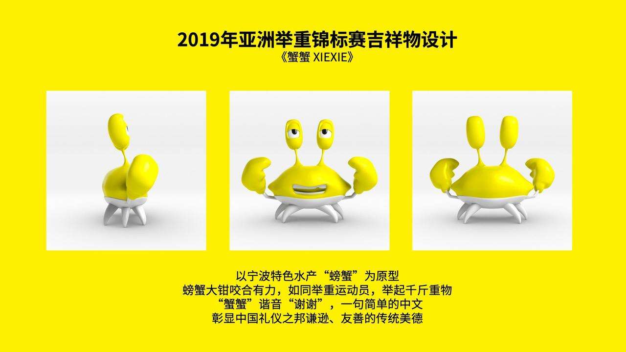 如大赛LOGO结合了“亚”、“甬”、“举重”、“鼓楼”、“鼎”等元素,吉祥物“蟹蟹”,以宁波人爱吃的螃蟹,螃蟹的大钳子咬合有力,如同举重举运动员举起千斤重物。而“蟹蟹”又谐音“谢谢”,彰显中国礼仪之邦谦逊、友善的传统美德。