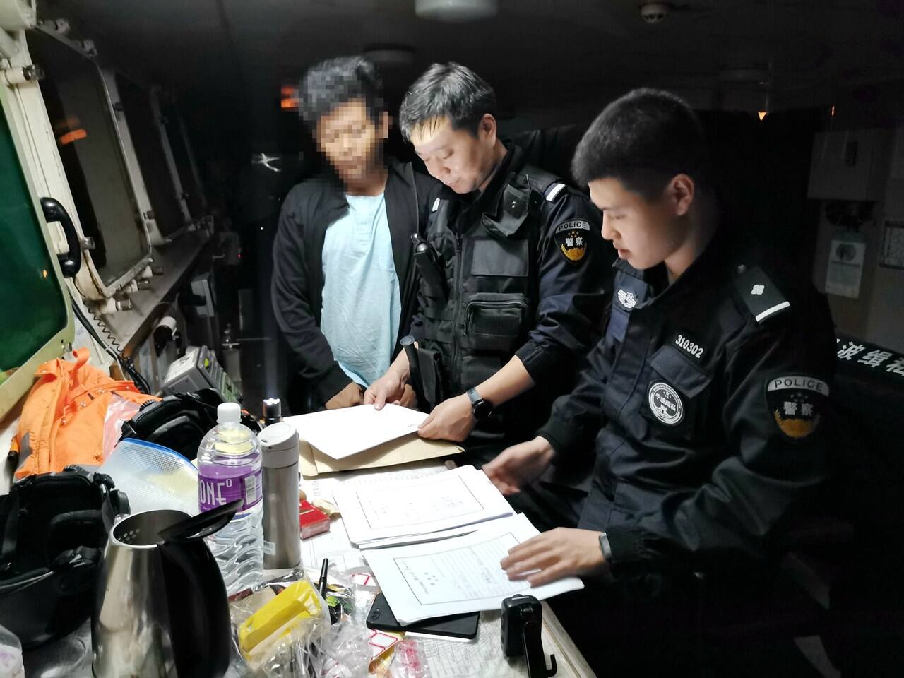 (宁波海关缉私警察讯问走私母船船员。 黄涛 摄)