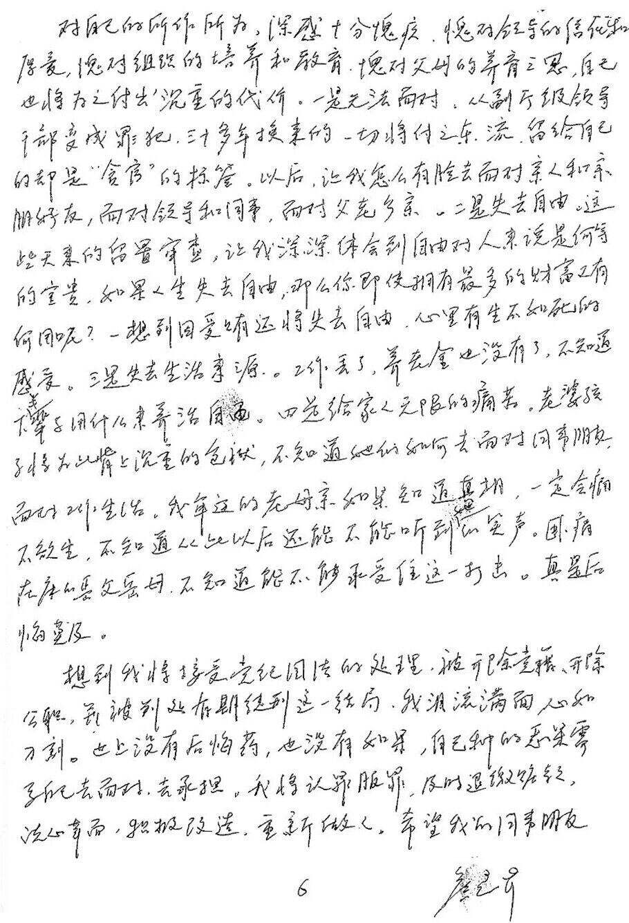 想到我将接受党纪国法的处理,被开除党籍、开除公职,并被判处有期徒刑这一结局,我泪流满面,心如刀割。世上没有后悔药,也没有如果,自己种的恶果需要自己去面对,去承担。我将认罪服罪,及时退缴赃款,洗心革面,积极改造,重新做人。希望我的同事朋友把我的经历作为警示案例,以我为鉴,做到敬畏法纪,严守底线,清白做人,干净做事。