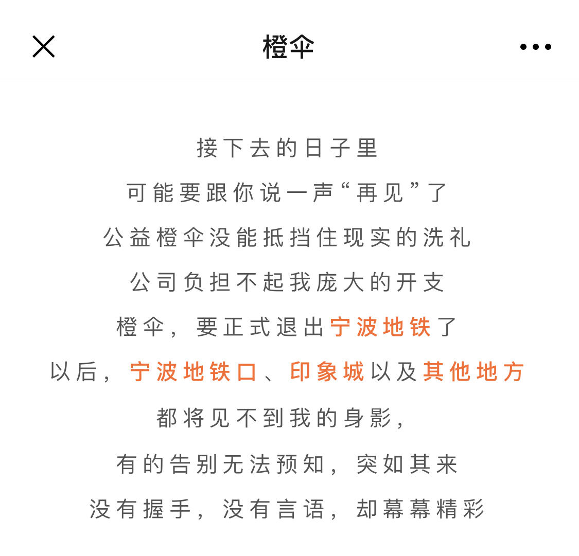 就在刚刚,宁波轨道交通方面也对外“官宣”:很遗憾,因运维公司无法承担公益橙伞项目的庞大开支,近期要正式退出宁波地铁各大车站了。我们一起见证了它的到来,也欣然接受它的离开。下一步,将督促橙伞运维公司做好押金退还工作。