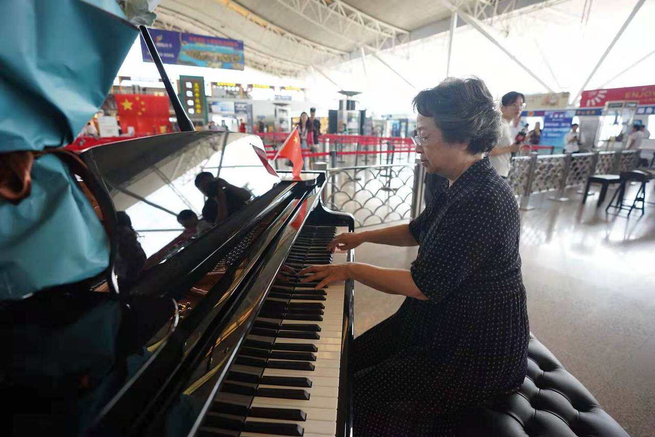 弹钢琴的老人是莫志蔚,今年夏天,莫奶奶因为捐赠公共钢琴一事被广大市民所熟知。她现场弹奏的就是安放在机场的那架公共钢琴。悠扬的钢琴曲中,一位拉着小提琴的女生走到了莫奶奶身边,不远处,一位机场安检员悄悄地端坐到了古筝前,用娓娓动听的弦音进行着合声。