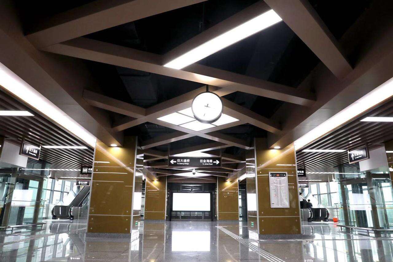 车站内装修定位主题为“书香人文”,车站整体装饰色彩为古竹简的黄金色,通过吊顶的“书简”铝方通造型、古诗句字体的转印等设计元素来体现车站的文化属性。