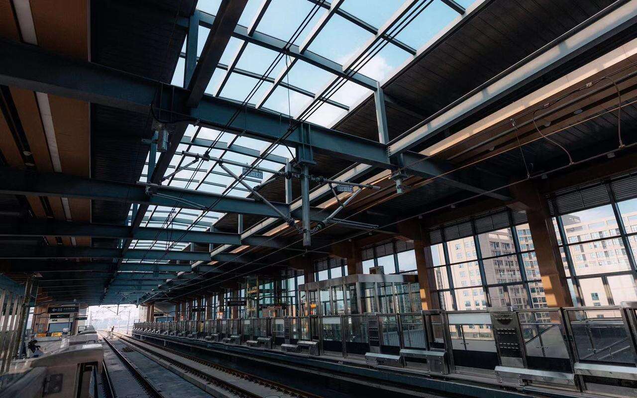 车站外装修设计为主题“腾飞之翼”,运用幕墙玻璃通透的特质,采用简洁的弧型线条勾勒出立面造型线,在视觉上增强了轨道交通建筑的动感,丰富了立面造型层次。
