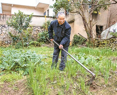 这两天,象山丹西街道杨蓬岙村92岁村民马定其一早背着锄头,到村东地里劳作,回来经过门前菜园,又忙着落锄除草松土……