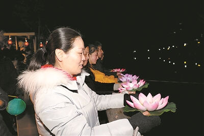 昨天晚上6时,千百盏河灯顺流而下,点亮了瞻岐镇东港横河,传统的“放河灯”习俗重现。不少特地从中心城区赶来的市民携老带幼,在底座上放灯盏,投于河道之中任其漂泛,并许下新年的美好祝愿。