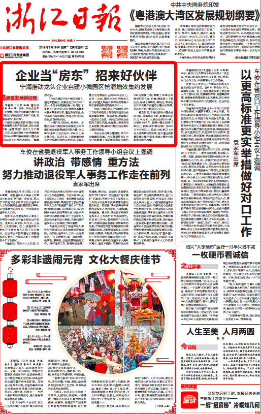 浙江在线-宁波频道2月19日讯(浙江在线记者 陈醉 通讯员 陈云松 金一恒)如今,龙头企业集约厂区资源,挤出空间组建小微企业园,招引门类相关的“房客”入园,在宁海县成为“新时尚”。
