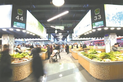 记者实地探访惠风西路邻里中心,一楼是鄞州首家五星级智慧菜市场,走进市场,中央空调系统保持温度恒定,喷雾系统保证室内湿度,LED大屏幕实时显示菜价和蔬菜检测结果,市场舒适、整洁、便利的服务,让人仿佛置身超市。