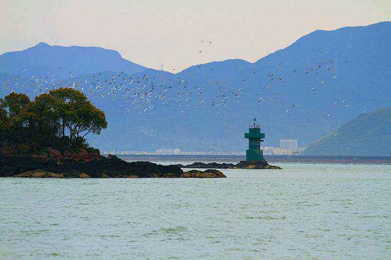 碧波万顷的宁海湾,岛屿点缀,景色绝美。待靠近一个名叫“狗山”的小岛时,只见上千只鹭鸟遮天蔽日凌空飞舞,“嘎嘎”的鸟鸣声传荡天际,千鹭齐飞的场景蔚为壮观,形成了山海间独特的自然景观。据同行的向导尤师傅介绍,这里栖息着白鹭、苍鹭、岩鹭、斑鹭等多种鹭鸟和其它不知名鸟类,是个名副其实的“鸟岛”。