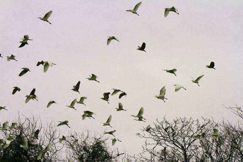 为了不随意惊扰这个“快乐王国”,我们并没有选择上岛,仅是远远拿着望远镜细细观察。栖息在岛上的鹭鸟羽毛以白色居多,也有不少灰色和靓色的。而头颈部的羽毛形状也有差异,有的是头顶长着两条像辫子一样的的矛状羽,有的则是背肩部饰着羽枝分散的蓑状长饰羽,形若穿着“蓬蓬裙”,很是优雅漂亮。它们或是支起长腿歇息,或是展翅飞翔,或是啄食小鱼,一副悠闲自在的模样。