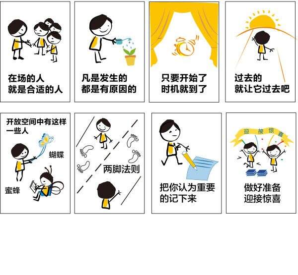“开放空间”诞生之初,是一项会议技术。1983年,哈里森·欧文组织了一场国际会议,它包括一系列严格的流程:1、准备工作,准备好纸笔和座位排放;2、向与会者说明具体的流程和规则;3、提出希望讨论的议题,并充分探究重要性;4、会谈开始,问题者耐心等待其他人的观点,与会者参与讨论;5、设立新闻墙,指定时间、指定小组进行讨论成果汇报;6、对所有的议题选择短期内可行的建议;7、将建议根据优先顺序排列;8、锁定主要的议题及其优先的建议,制定行动计划实施。
