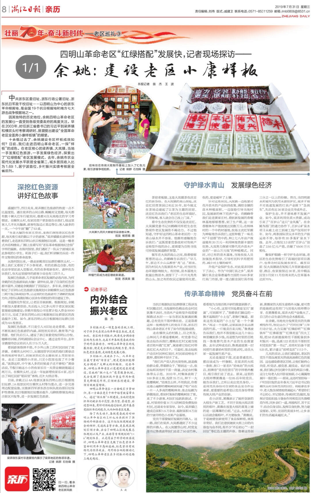 十余载过去了,余姚建设老区样板成效如何?日前,我们走进四明山革命老区,一探“样板”的成色。在老区核心的梁弄镇、大岚镇,当地一手发展红色旅游,一手发展绿色经济,探索出了“红绿搭配”老区发展模式。去年,余姚市农业现代化发展水平跃居全省第二,城乡居民收入比为1.69∶1,居宁波首位,乡村振兴实绩考核居全省前列。