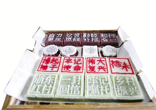 在小店里,黄薇演示了她所创新的大糕生产新工艺。不同于其他大糕店常用的粽叶,黄薇在放置大糕的蒸笼上铺的是一层薄薄的白纸。“过去,大糕凉了以后就会黏粽叶,不方便取食。”黄薇说,于是她便创新使用了食品保鲜纸,效果非常好。我们注意到她家大糕上印的内容也与众不同,有不少“不忘初心”“一封回信”等红色主题的内容。靠着这些创新,黄薇家的大糕生意格外火爆,更可贵的是她把这些窍门与其他大糕师傅分享。在黄薇看来,梁弄大糕产业做大了,自己的小店生意自然也会水涨船高。