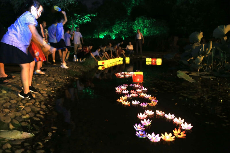浙江在线-宁波频道9月12日讯(浙江在线记者 吴晓鹏 通讯员 吴大庆)9月11日晚,余姚市阳明街道龙泉社区组织居民来到龙山公园西麓的池塘边,将主题为 “爱我中华”的精美莲花灯投放至水面上。