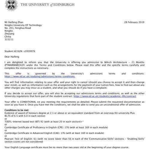 最先收到的是爱丁堡大学的录取通知书,当他得知被录取时,赵海峰觉得既激动又平静。几天后,AA建筑联盟学院也向他伸出了橄榄枝。接下来,伦敦大学的学院推研信也递到了赵海峰的邮箱里,相当于是预录取通知。