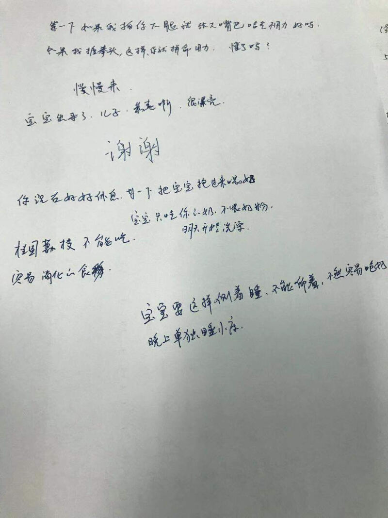 小李看了看宝宝,又看了看纸上的一行行字,尽管已是疲惫不堪,但还是用力在纸上写下了"谢谢"两字。