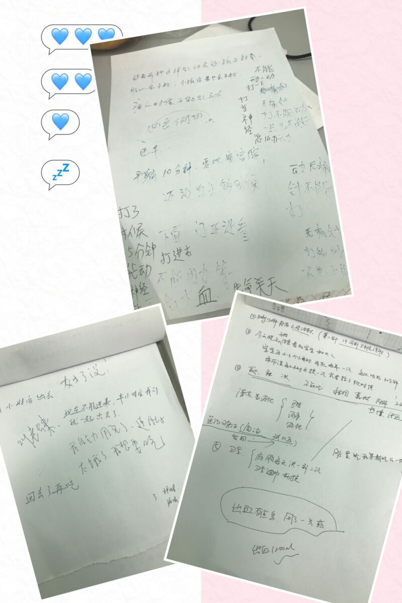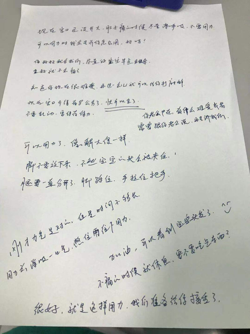 "现在宫口还没开大,肚子痛的时候尽量深呼吸,不要用力,可以用力时我会告诉你,好吗?""可以用力了,像解大便一样。""脚不要放下来,不然宝宝的头会被夹住!""刚才用力是对的,但是时间不够长。""加油,可以看到宝宝头发了。"……每写一段话,俞勤就会把纸张拿给小李看,让她照着要求做,并不断鼓励她,整个过程足足写满了5张A4纸。