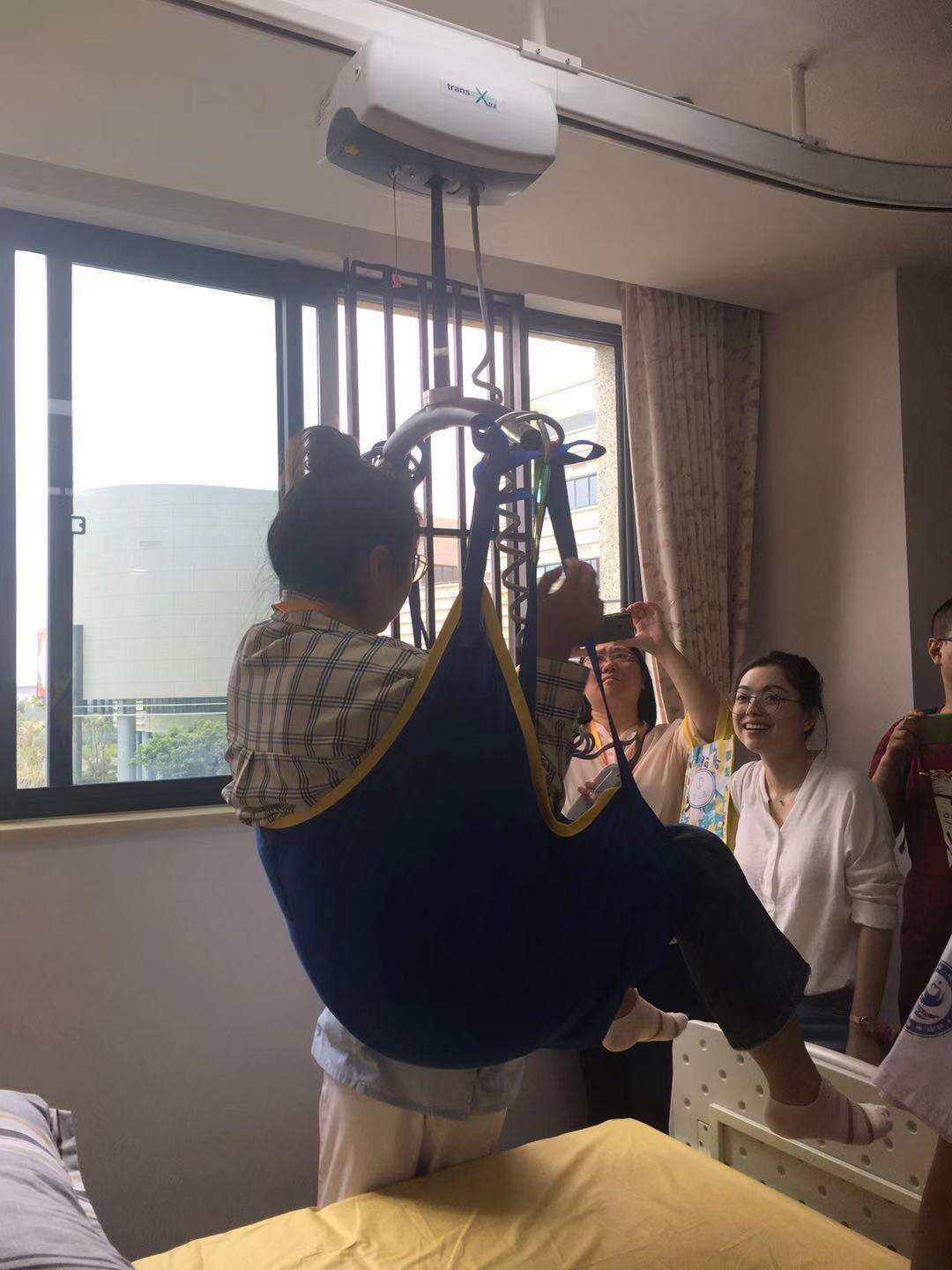 走访中,记者在病房发现一个“缆车”。为了更好的照顾失能,尤其是行动不便的老人,医院引入先进的“天轨”移位系统,行动不便的老人,躺在病床上可以自己操作“缆车”,吊着吊篮,带着自己移位、如厕、沐浴,甚至还可以到隔壁病房串门。