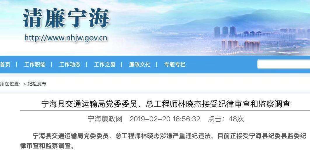 浙江在线-宁波频道2月21日讯(浙江在线记者 王凯艺)2月20日,宁海县纪律检查委员会、监察委员会发布消息,宁海县交通运输局党委委员、总工程师林晓杰涉嫌严重违纪违法,目前正接受宁海县纪委县监委纪律审查和监察调查。