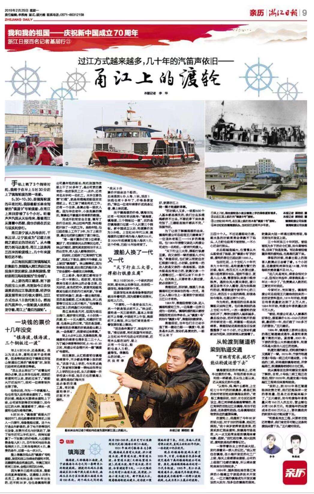 2月25日,浙江日报整版刊发了“我和我的祖国,庆祝新中国成立70周年”系列策划之百名记者基层行第21篇。全文从记者亲历的角度,讲述镇海轮渡最后的“坚守”故事,以小见大,展现甬江两岸的发展变迁。全文如下: