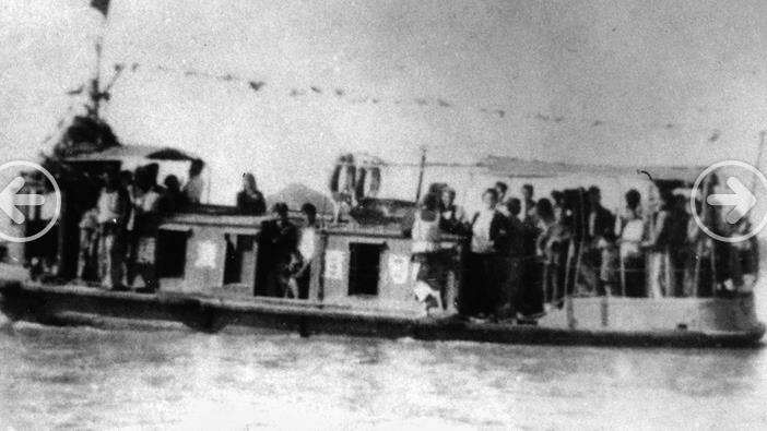 上世纪60年代,在江面上航行的木制“镇渡1号”渡轮。 镇海轮渡公司供图