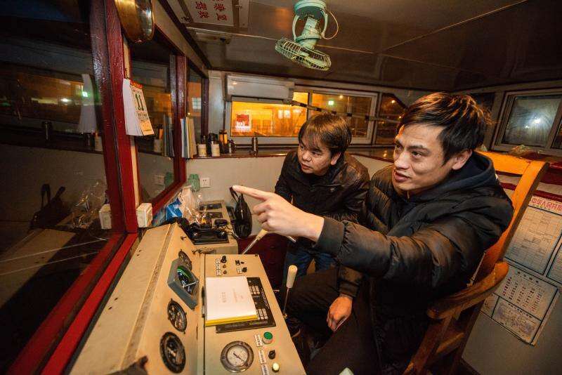 “现在条件算好了,早些年才叫苦。”接过话茬,轮机张国伟对我说,上世纪80年代他进公司的时候,还有木头船在运行,船上只有一个马达,船舵也是人力舵,重得很。停靠码头的时候,一次没有停好,就要在江上绕一圈才能重新停靠。