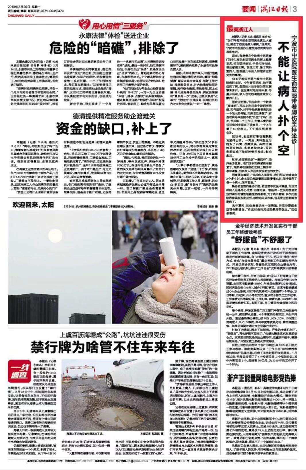 浙江在线-宁波频道2月25日讯(浙江在线记者 王波 通讯员 陈君艳)“你们呼吸科的俞亚丽医生真让人感动,脚伤了还在给病人看病。”这两天,宁波市中医院办公室接连收到类似的表扬电话。