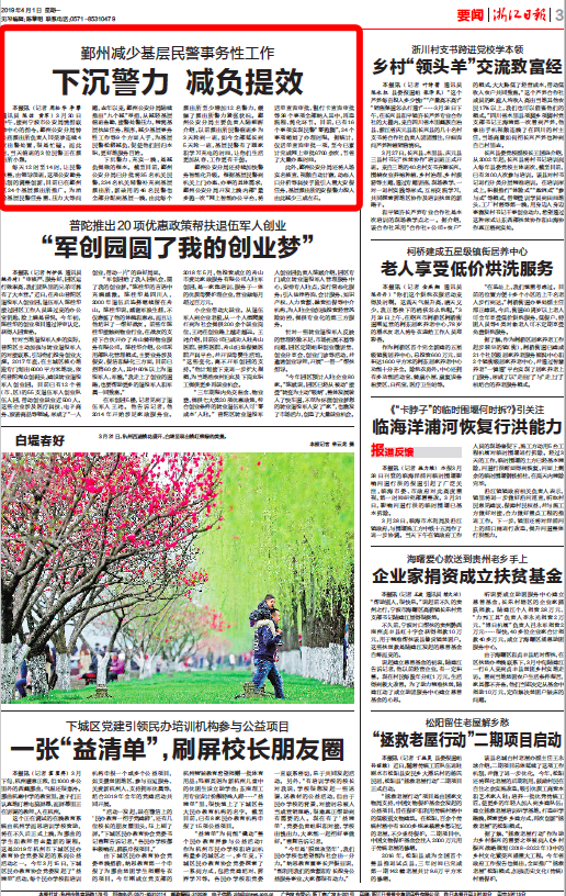 每天12时至14时,让民警休整,由领导顶班,这项公安勤务机制的调整创新,目前已在鄞州区24个基层派出所推广。为消除基层民警任务重、压力大等问题,去年以来,鄞州公安分局陆续推出“九个减”举措,从减轻基层值班备勤、接警处警压力,精简基层执法任务、程序,减少基层事务性工作等9个方面入手,为基层民警松绑减负,促使他们回归本职,更好地服务百姓。