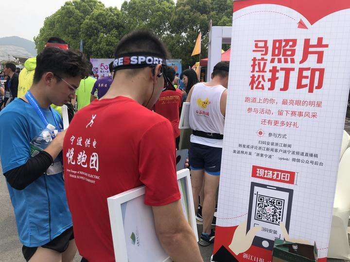 除了精神上的鼓舞之外,在终点的赛后放松区,浙江新闻客户端展台的“福利”也是围满了跑者,大家纷纷拿出手机打印自己赛道上的靓照,并在浙江新闻展位前留影,发到朋友圈与朋友亲人分享这份喜悦。