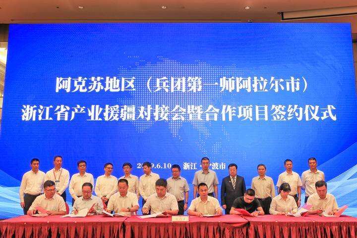 浙江在线-宁波频道6月10日讯(浙江在线记者 王波 俞刘东)“阿克苏核桃很好,今年我们还将再建3个工厂。”10日上午,新疆阿克苏地区(兵团第一师阿拉尔市)·浙江省产业援疆对接会暨合作项目签约仪式在宁波举行,来自阿克苏浙疆果业有限公司总经理赵文革拿着签约书激动地说。与其一同签约的还有其他23个项目,总签约金额61.84亿元。