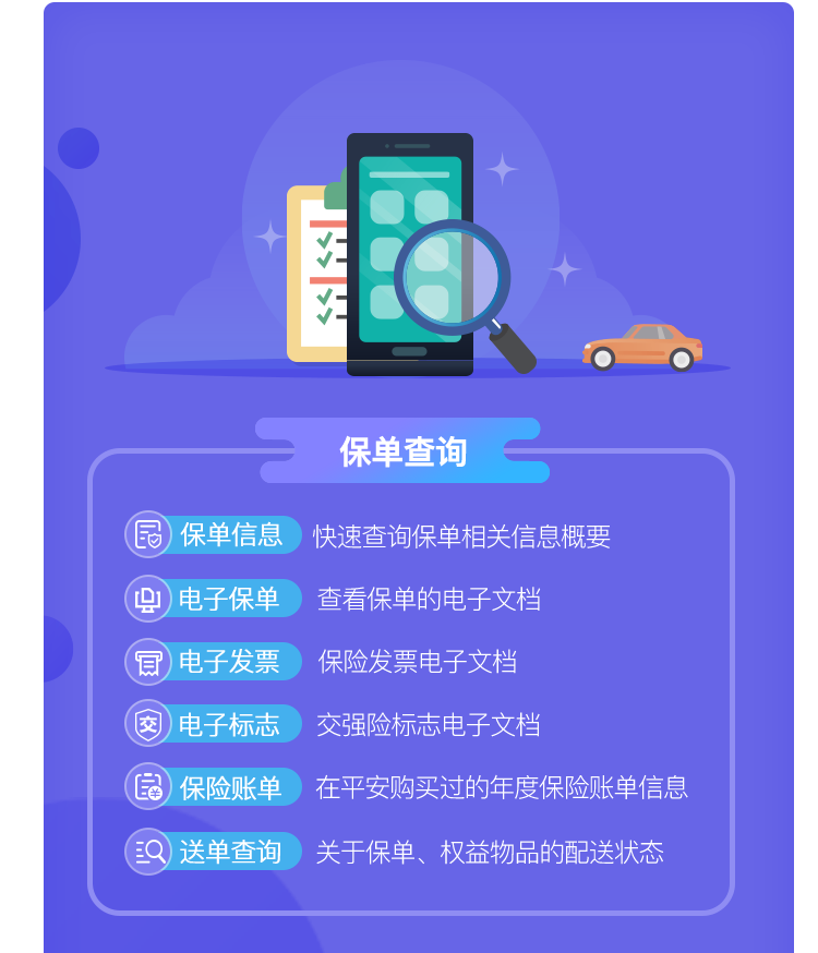 不必再担心保单遗失、损坏等问题,保单中心储存电子保单,可以随时登陆平安好车主查看。