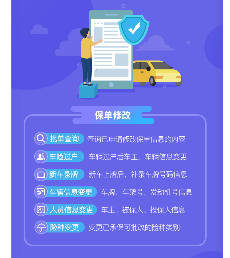 在这里,你可以修改新车录牌、车险过户、险种变更等信息,免跑门店。