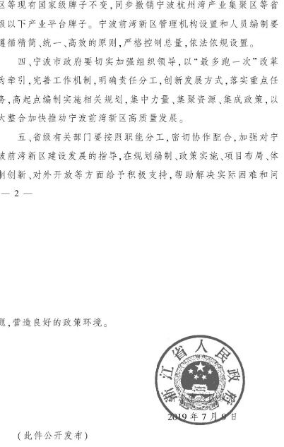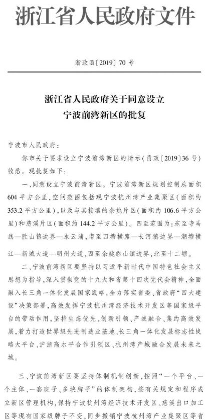 你市关于要求设立宁波前湾新区的请示(甬政【2019】36号)收悉。现批复如下: